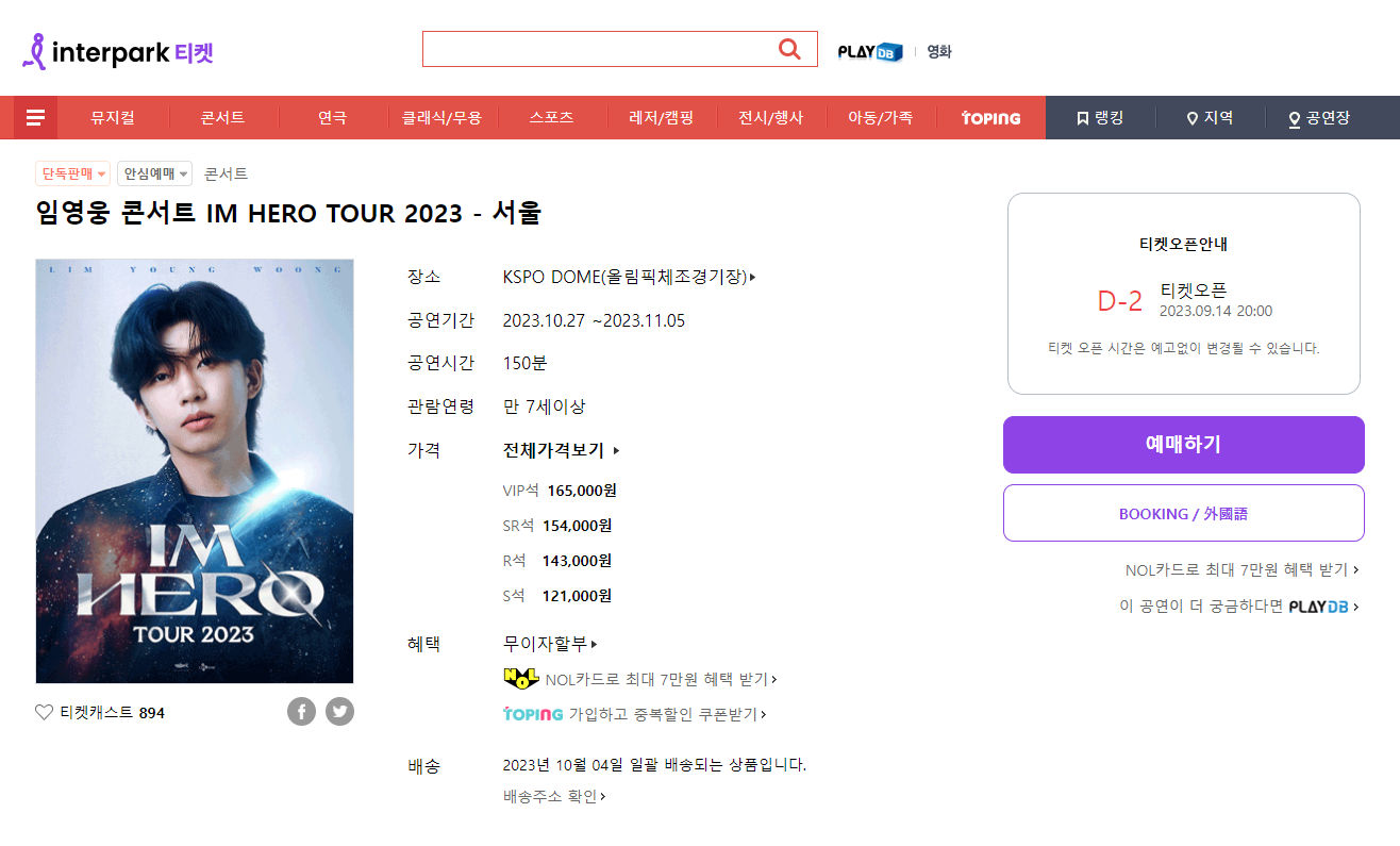 임영웅 콘서트는 인터파크에서 단독판매하고 있습니다. 몇 초만에 매진될 정도로 인기가 높은 만큼 아래 링크에서 빠르게 예매 바랍니다.