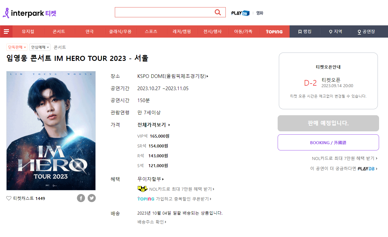 임영웅 콘서트는 인터파크에서 단독 판매하고 있습니다. 단 몇 초만에 매진될 정도로 큰 인기를 끌고 있는 임영웅 콘서트 꼭 예매 성공하시고 부모님께 효도하셨으면 좋겠습니다.