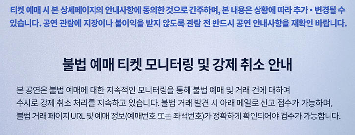 - 티켓의 취소/변경/환불은 예매하신 해당 예매처에서만 가능합니다. 티켓 예매/취소 마감시간 이후 및 공연 당일에는 변경 및 환불이 불가합니다.