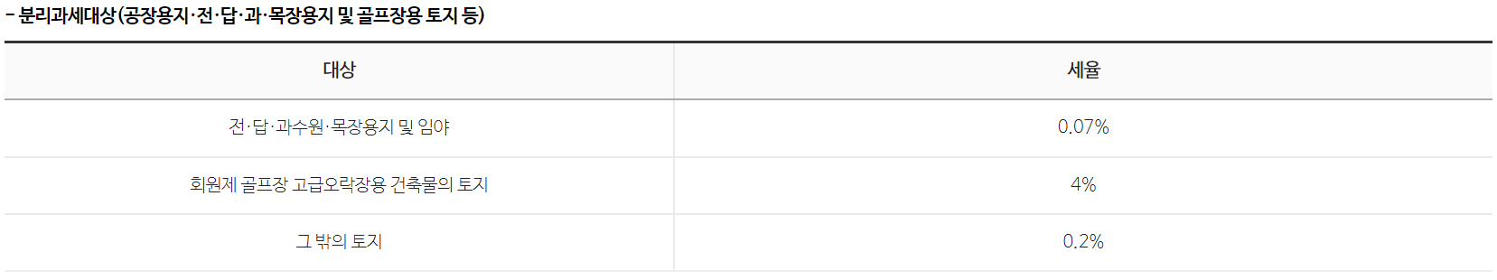 2) 토지 : 0.2%~0.5% (종합합산·별도합산·분리과세대상에 따른 3단계 누진세율)