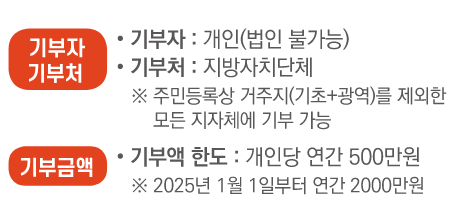 - 기부액 한도 : 개인당 연간 500만원 (내년(25년)부터는 최대 연간 2000만원 기부 가능)
