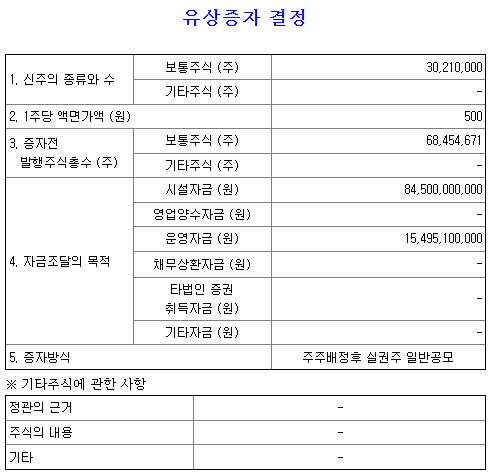 하지만 타 기업의 유상증자와 달리 채무 상환 금액이 없으며 장기적으로는 R&D 투자와 공장 인수 등의 긍정적인 요소가 주가에 긍정적인 영향을 미칠 것으로 보입니다.