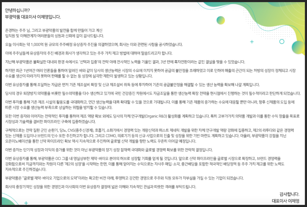 * 부광약품 유상증자, 배당금 결정 등 주요 공시 내용은 아래 전자공시사이트에서 확인바랍니다.